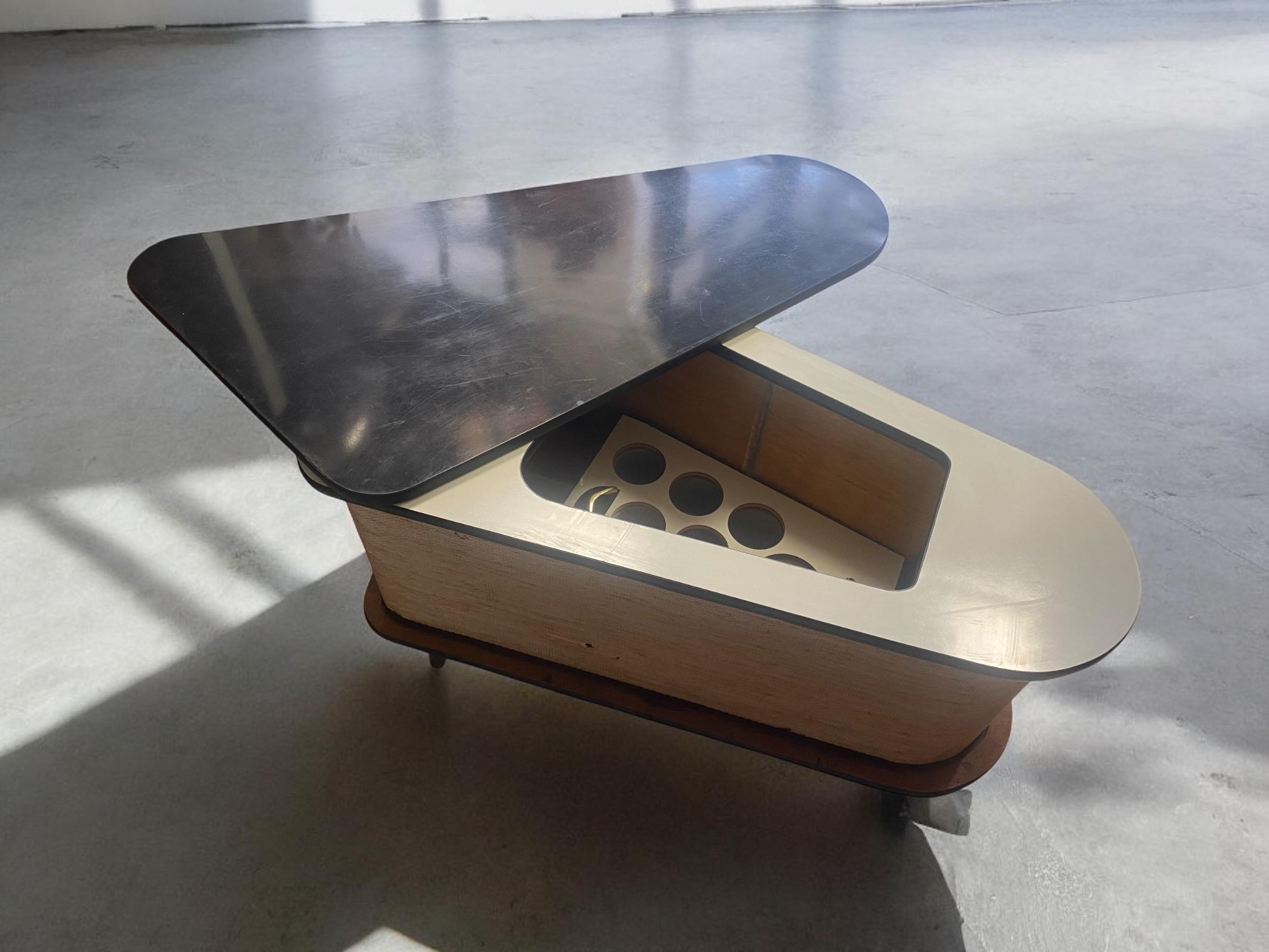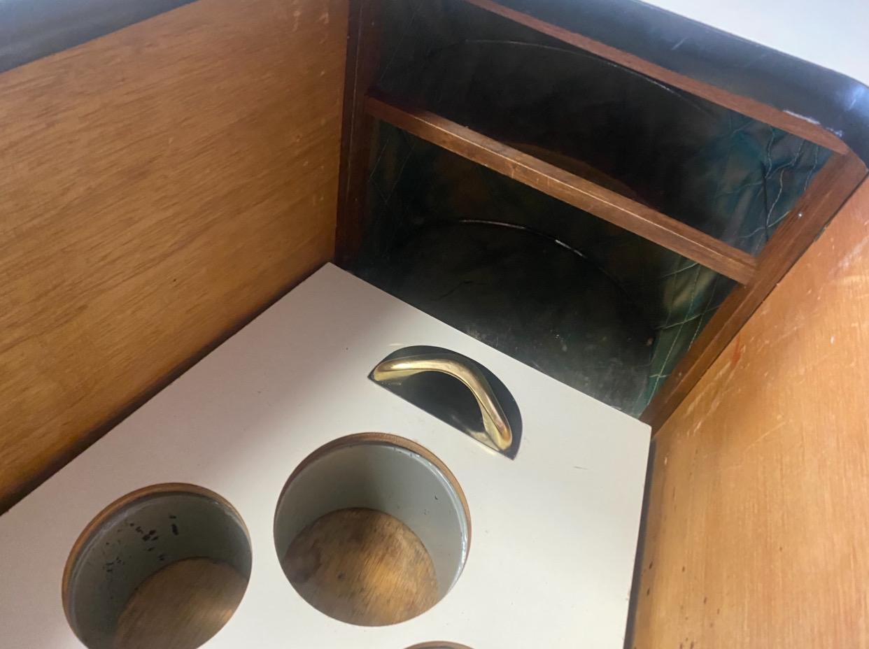 The large top panel can be swung to the side. Beneath it is a bar compartment for bottles. This can be slid upwards and then locked into place. Includes a cooling compartment for three bottles. Also included are two mirrored shelves for glasses,...