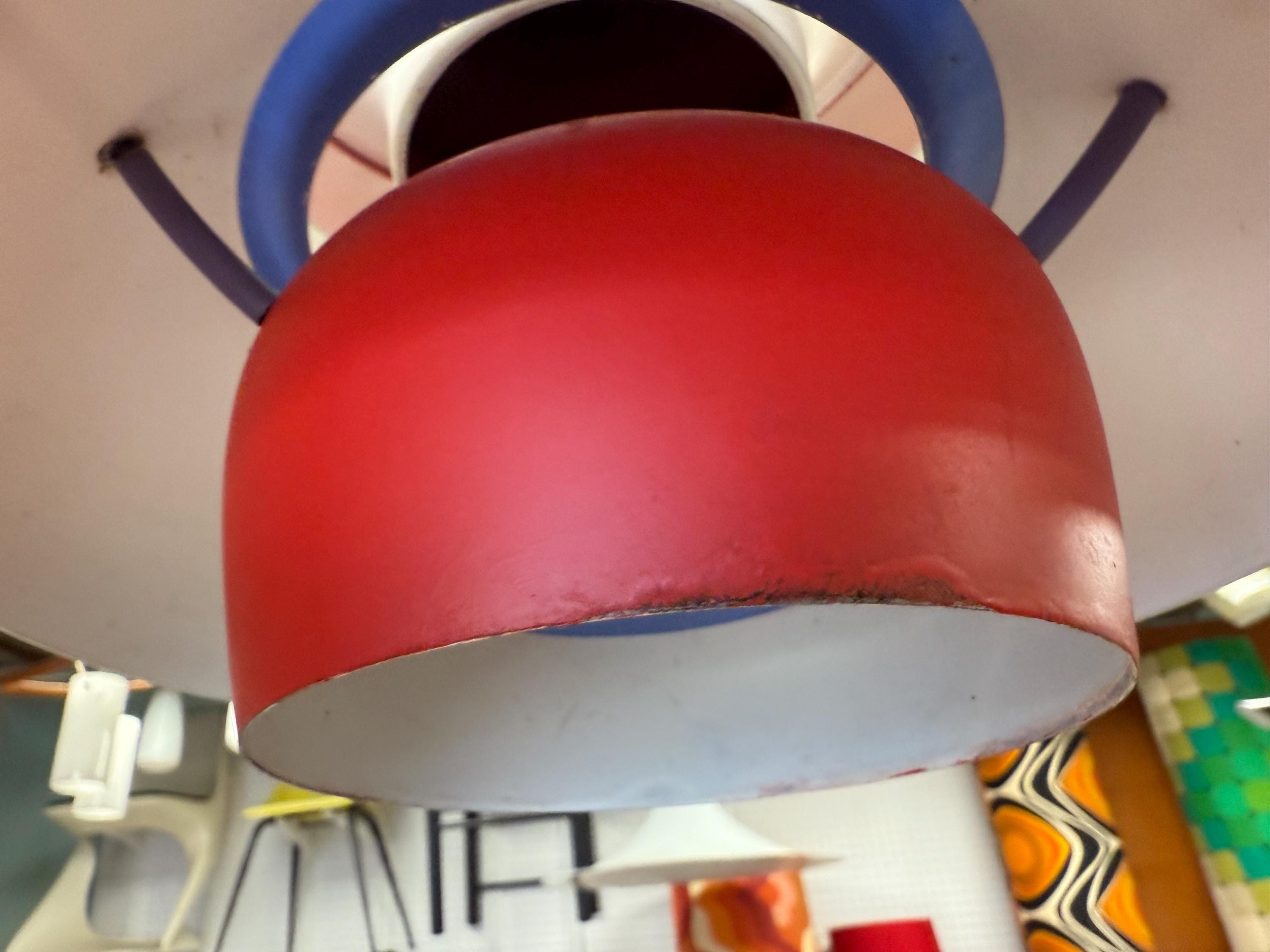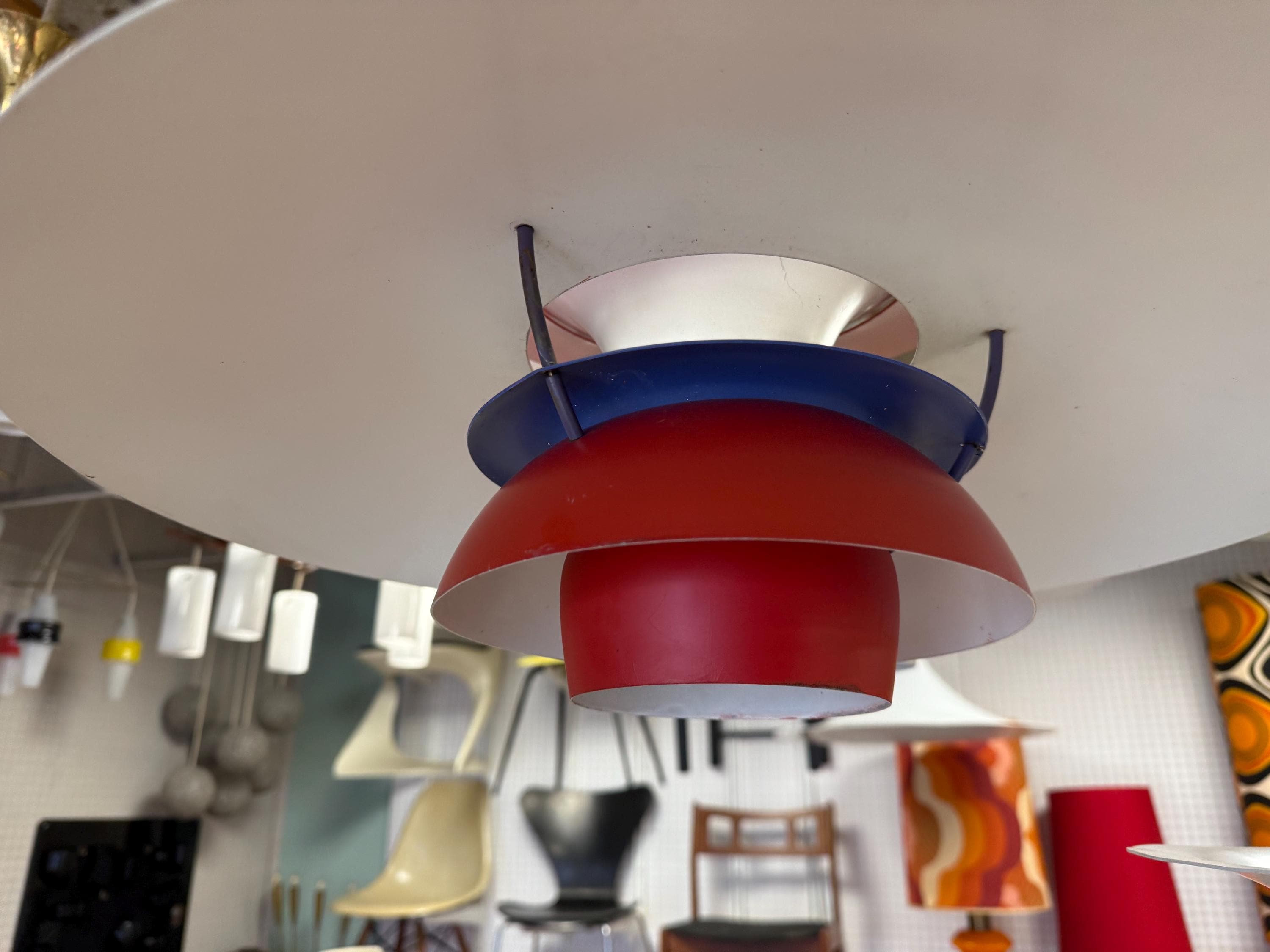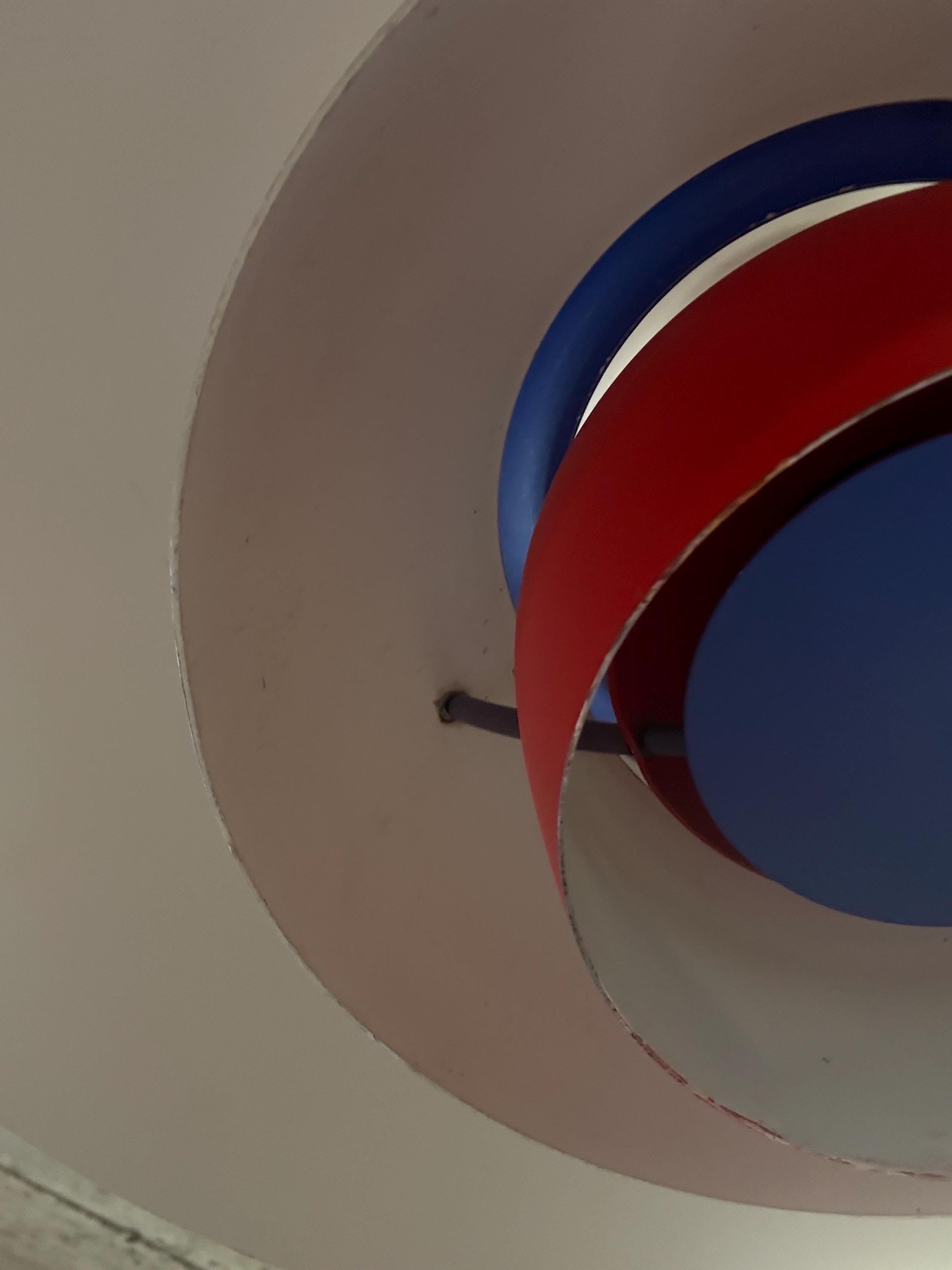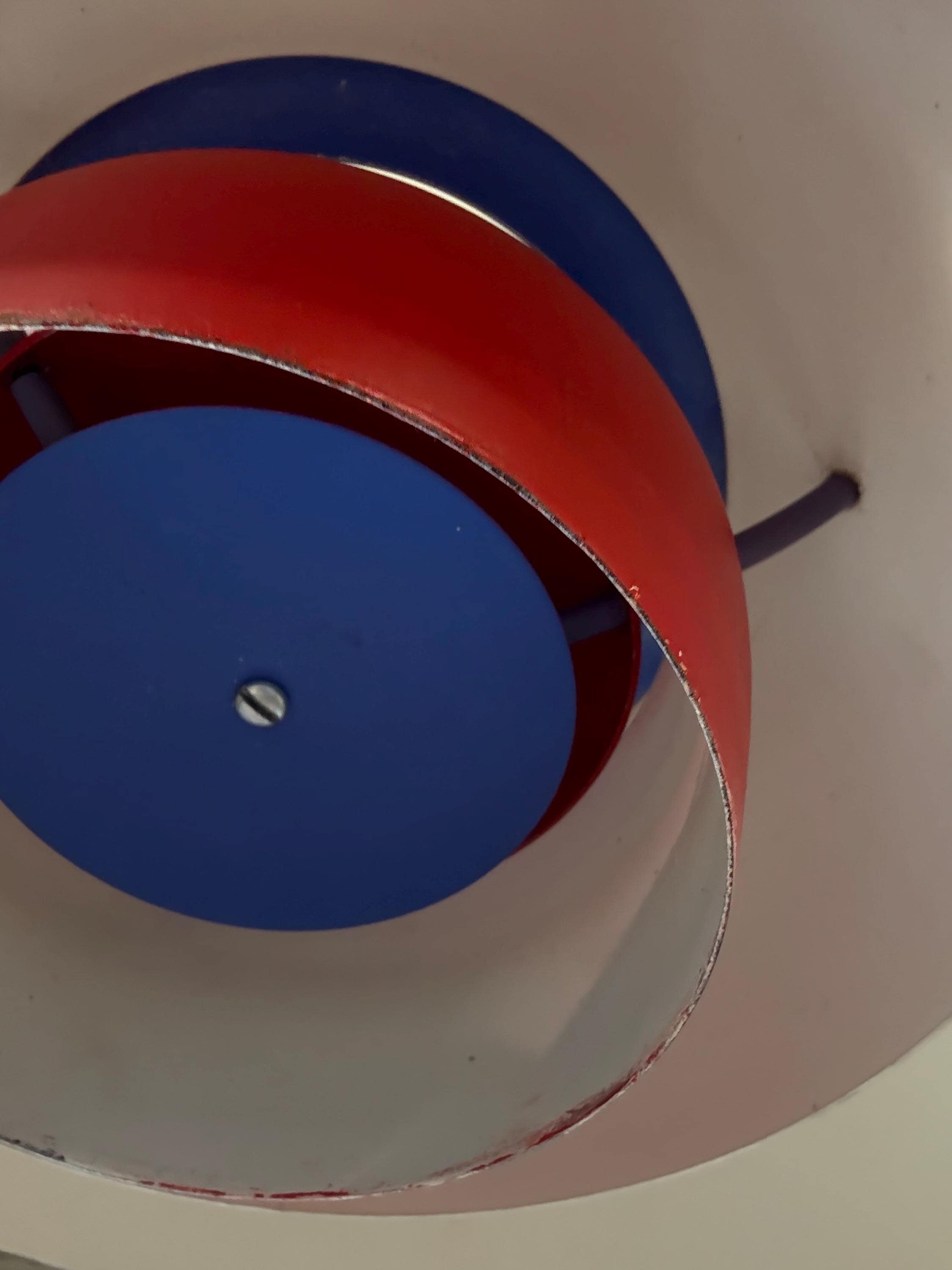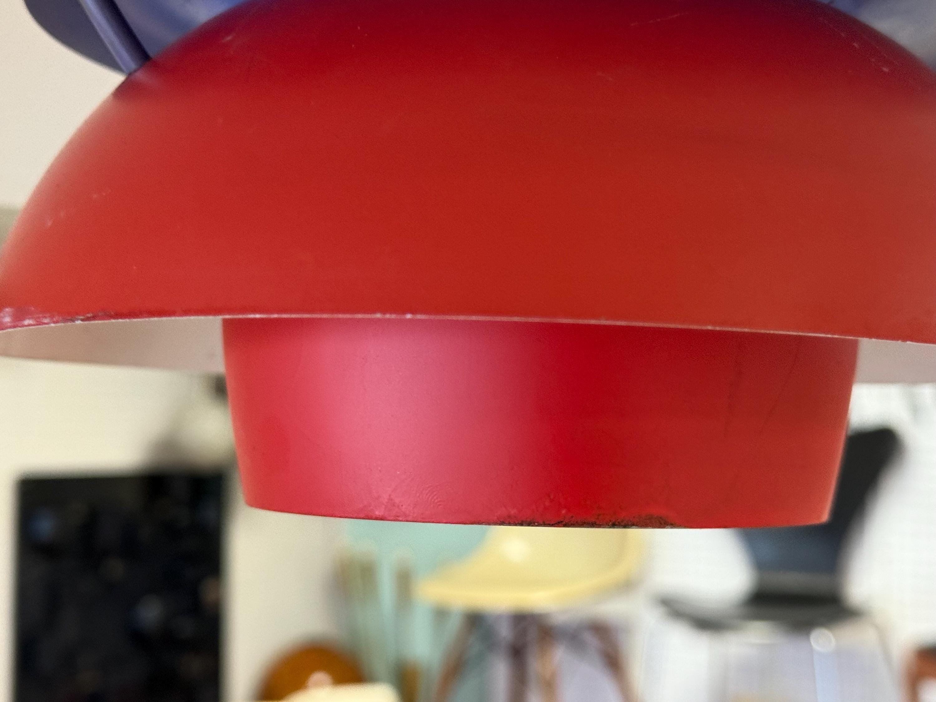 A design classic. PH 5 in an early version in original red, with blue accents.