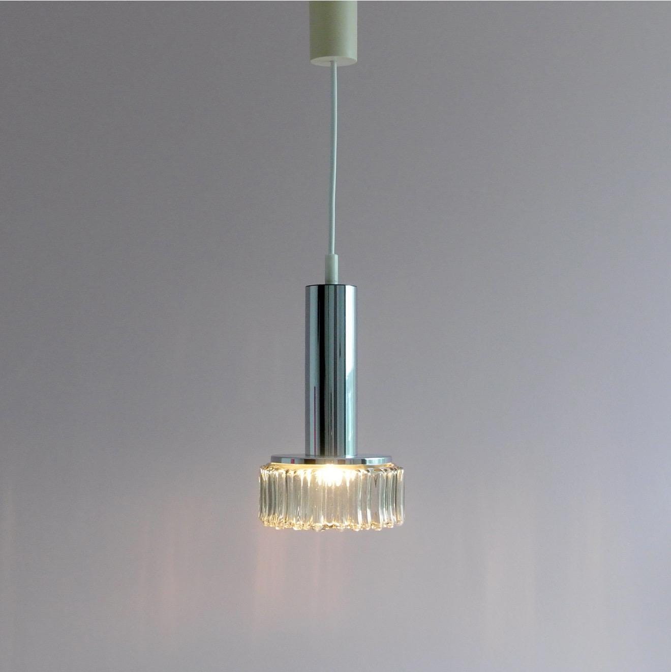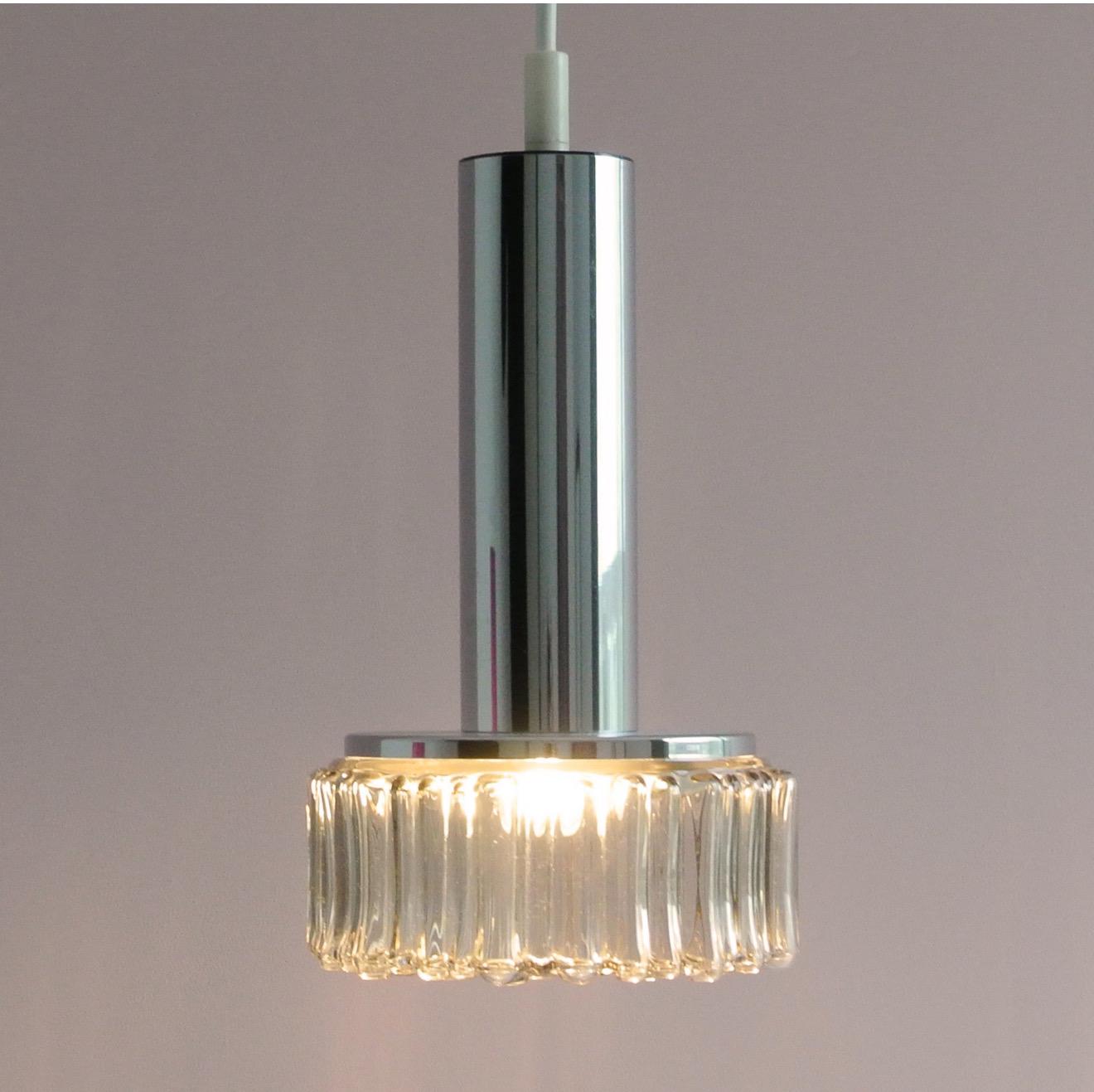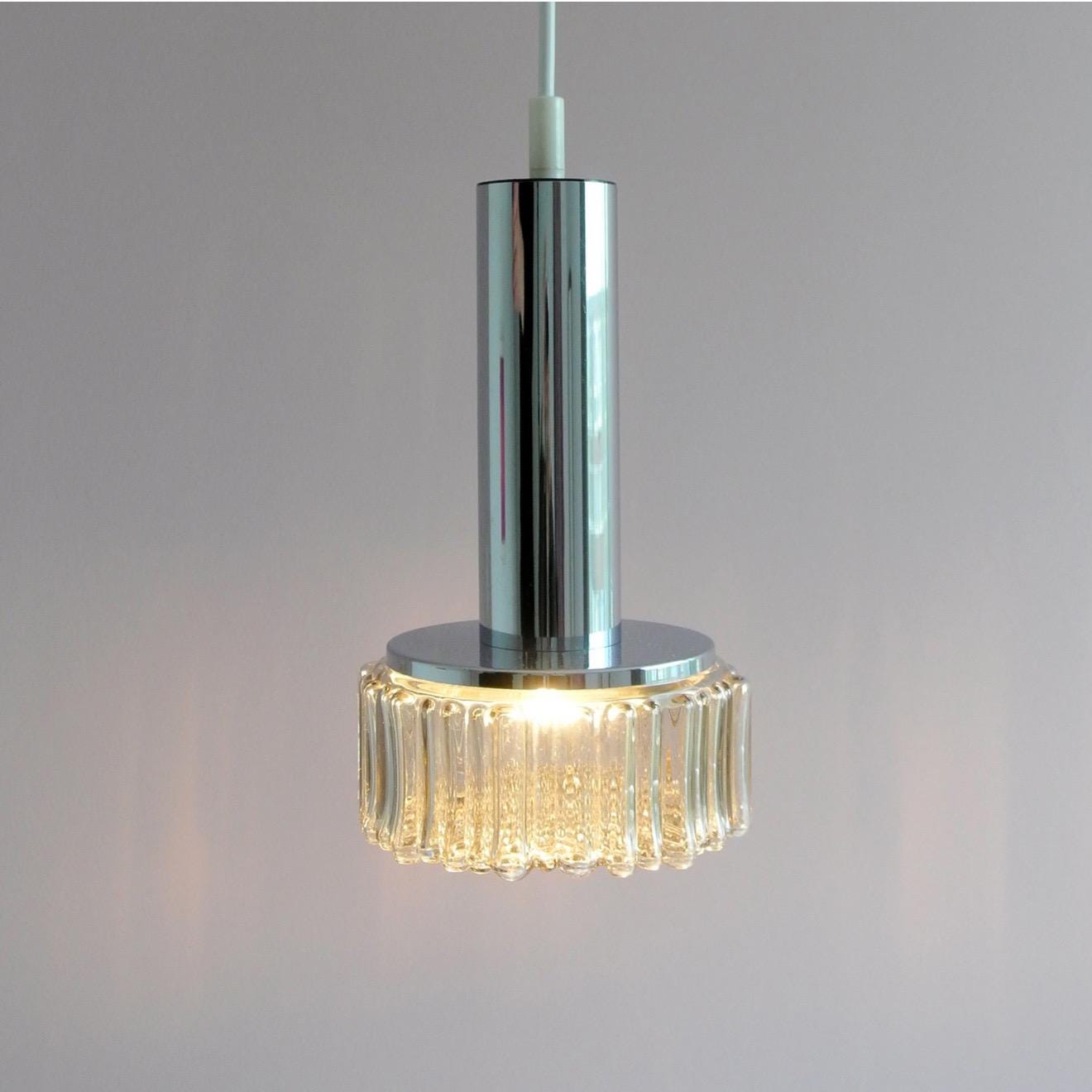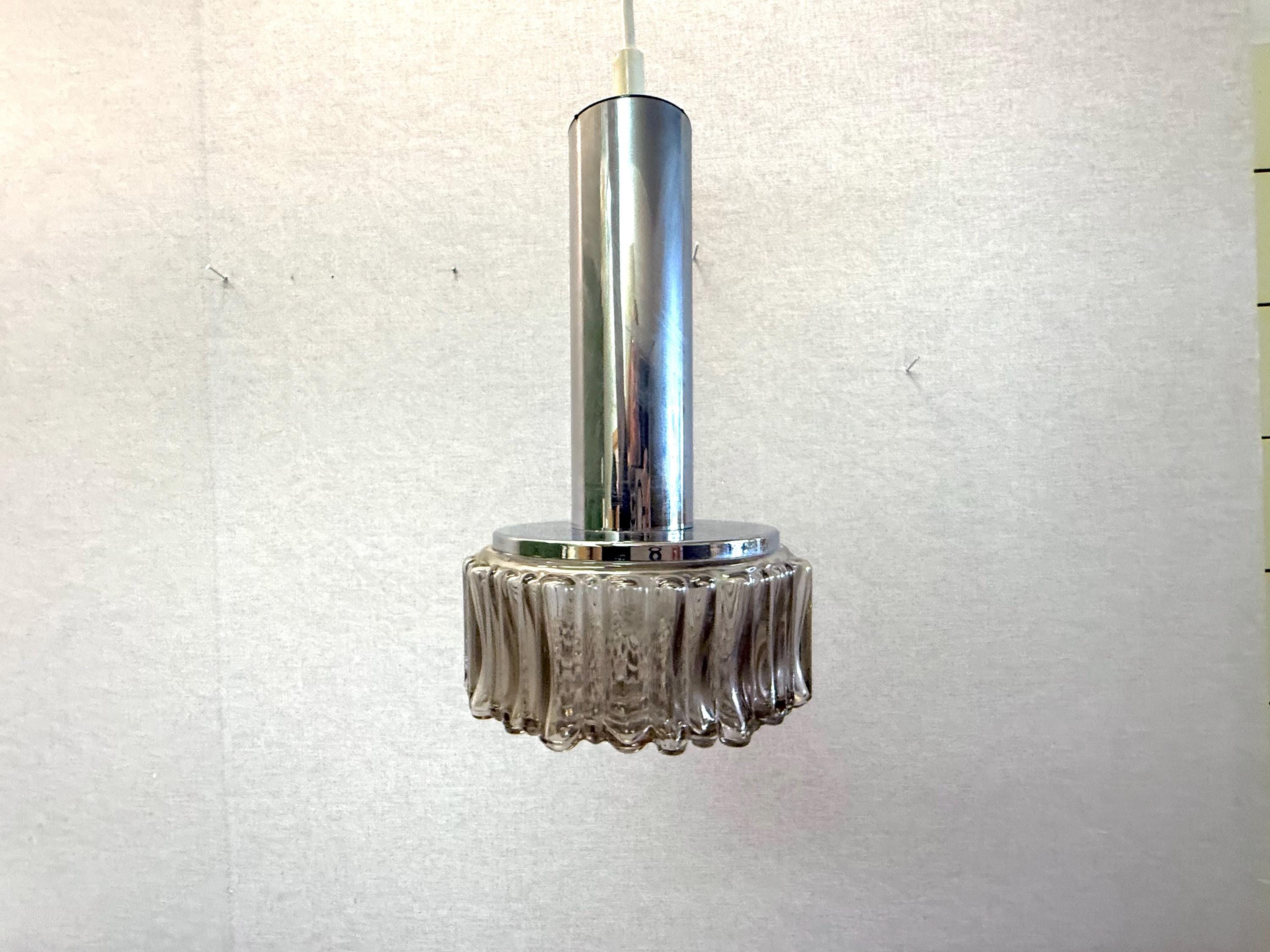 The lampshade elements of this lamp are extremely rare and very beautiful. The length of the pendants/lights can be individually adjusted and thus perfectly adapted to your ceiling height. Minimal signs of age on metal elements and glass.