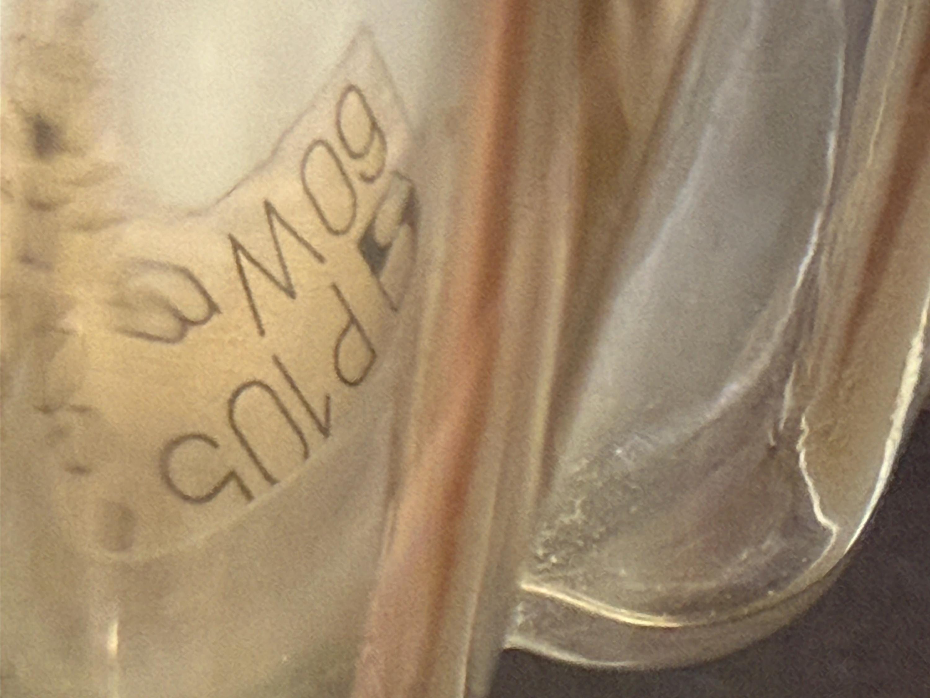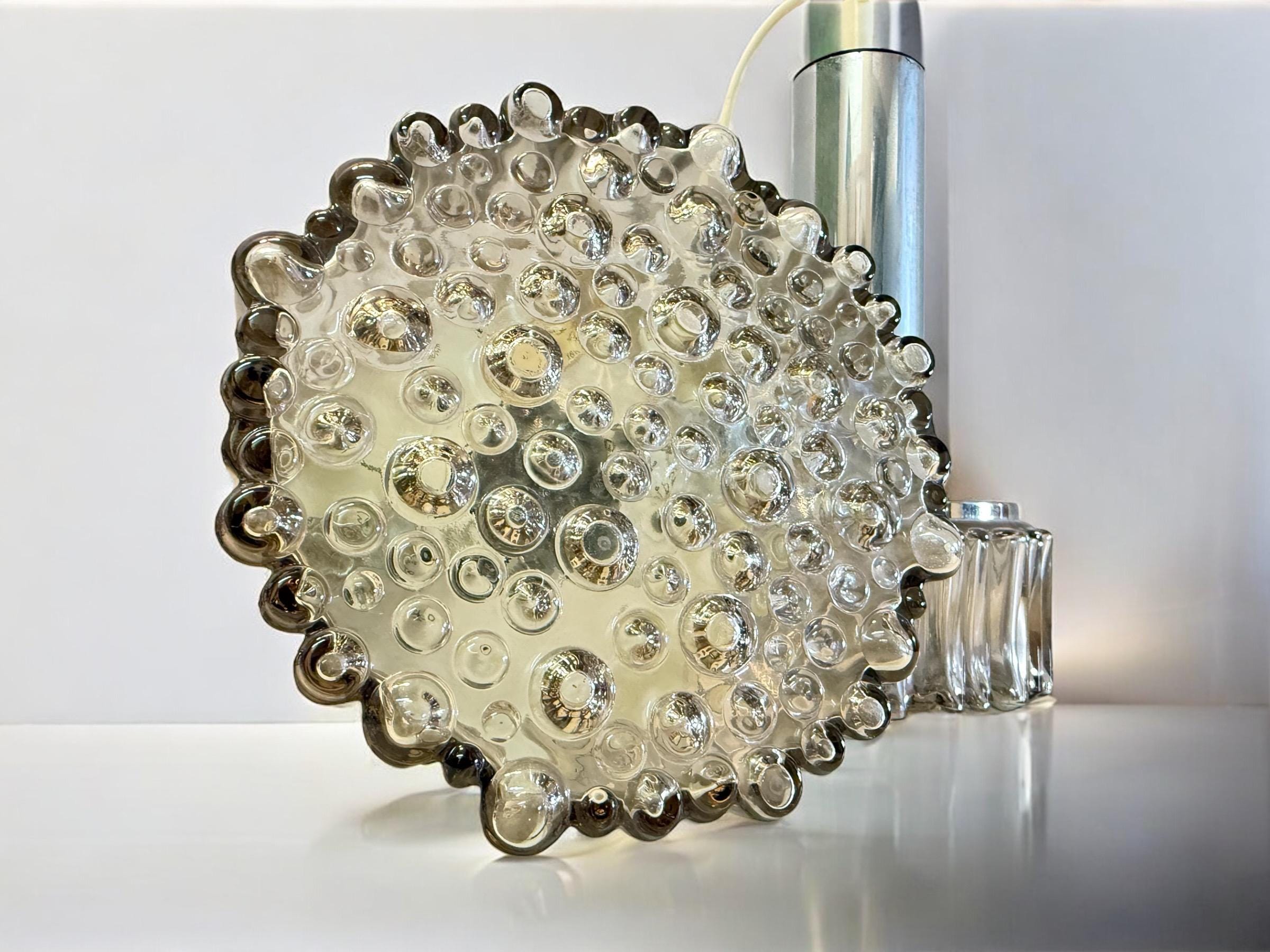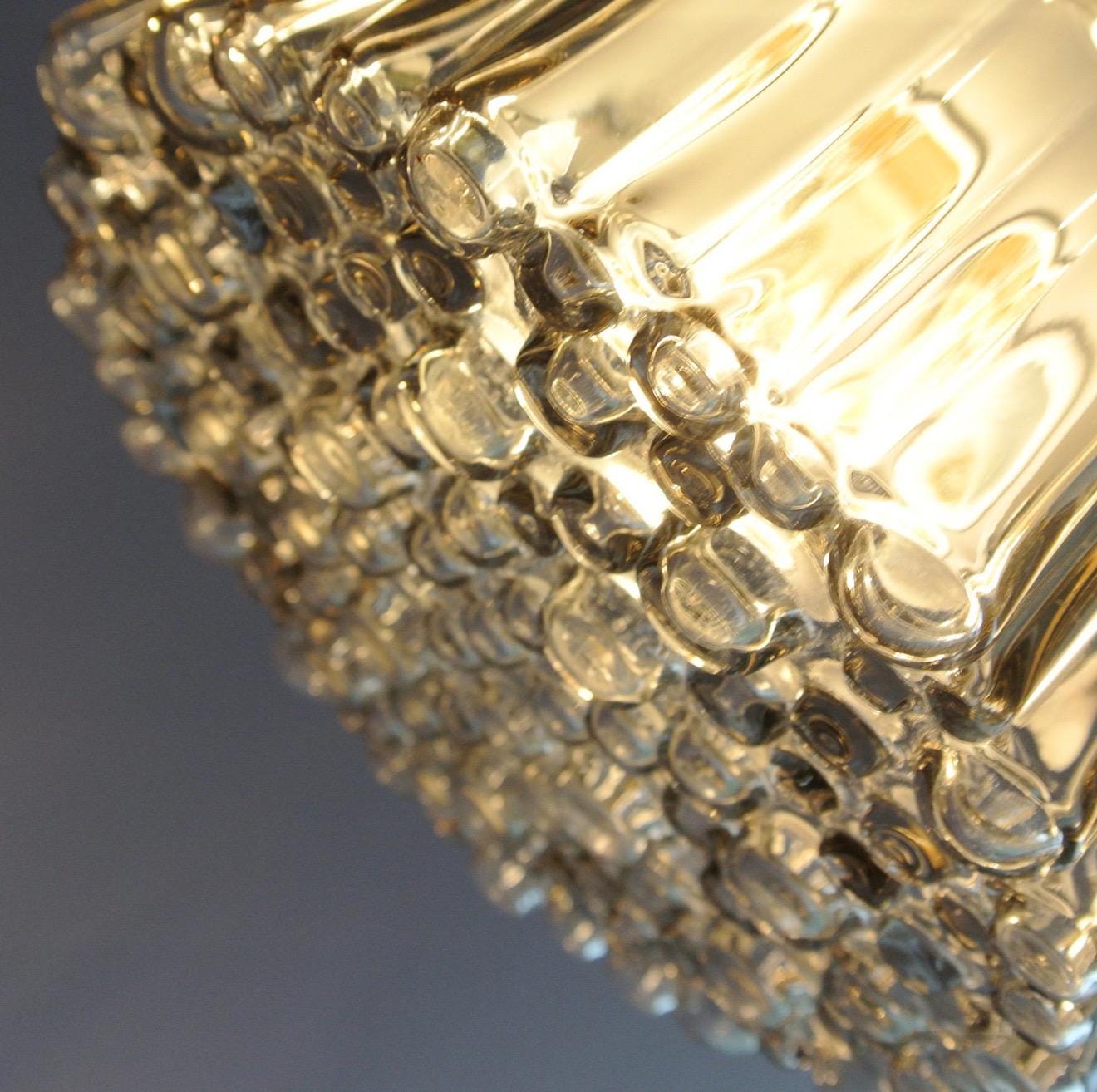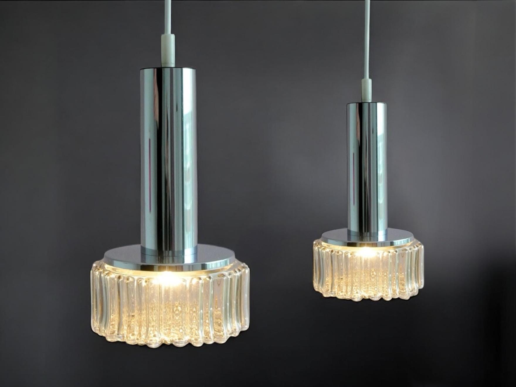 The lampshade elements of this lamp are extremely rare and very beautiful. The length of the pendants/lights can be individually adjusted and thus perfectly adapted to your ceiling height. Minimal signs of age on metal elements and glass.