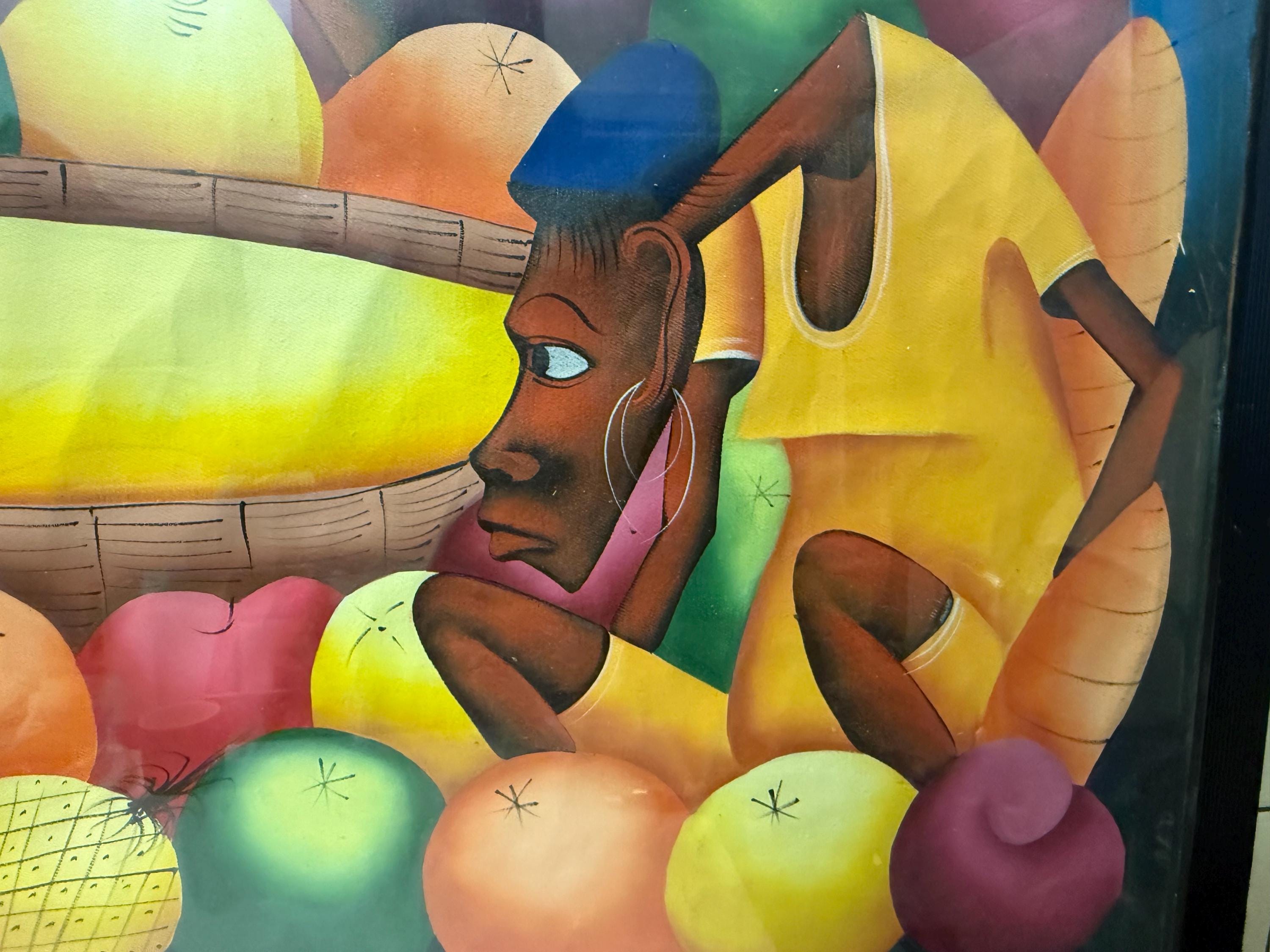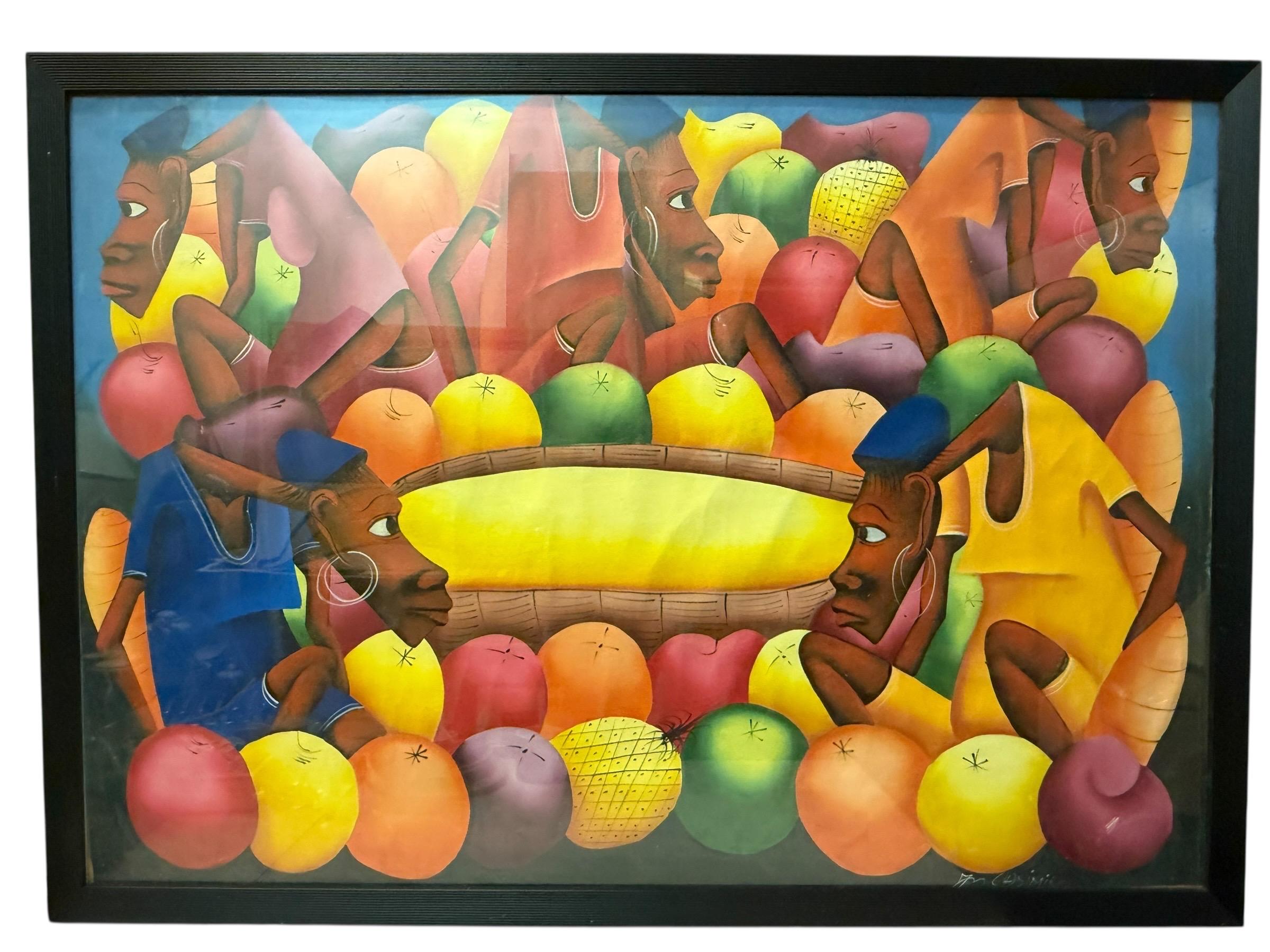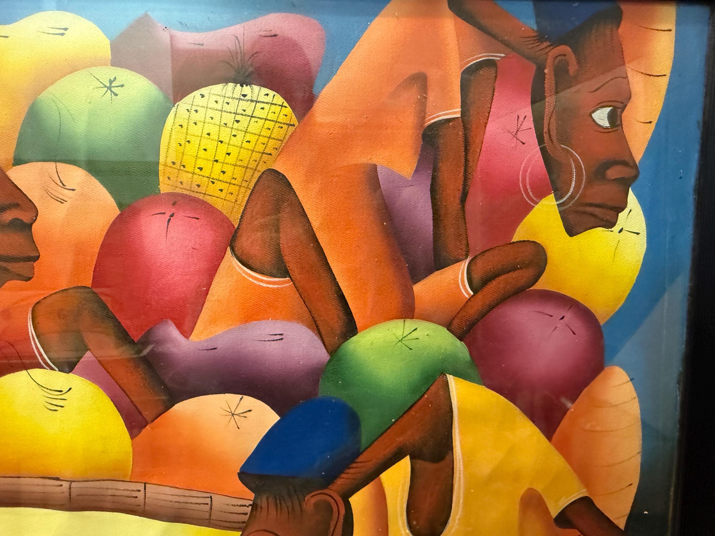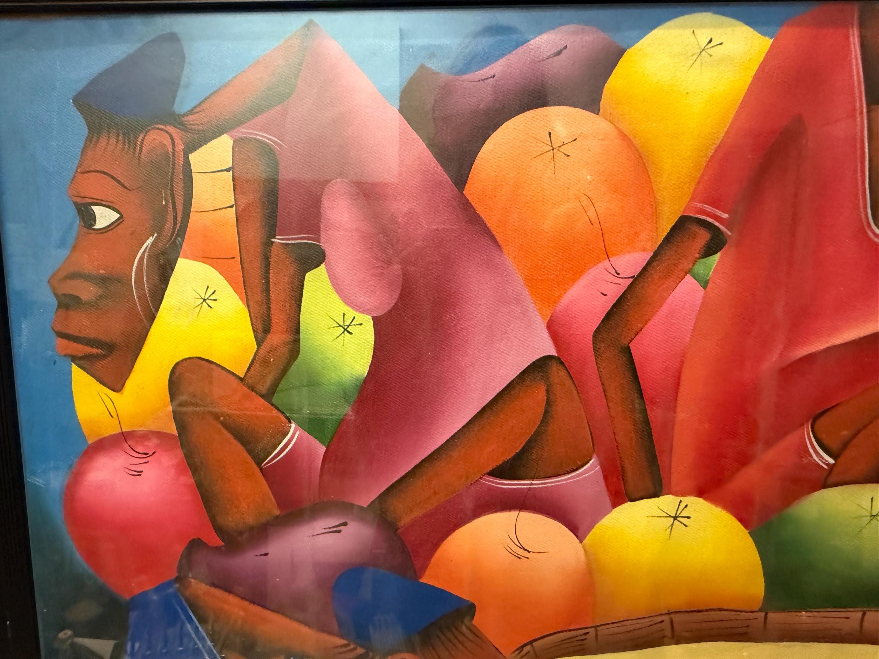 Vintage XL original oil painting by Haitian artist Laurent Casimir (1928-1990), Cubist milieu study, MCM