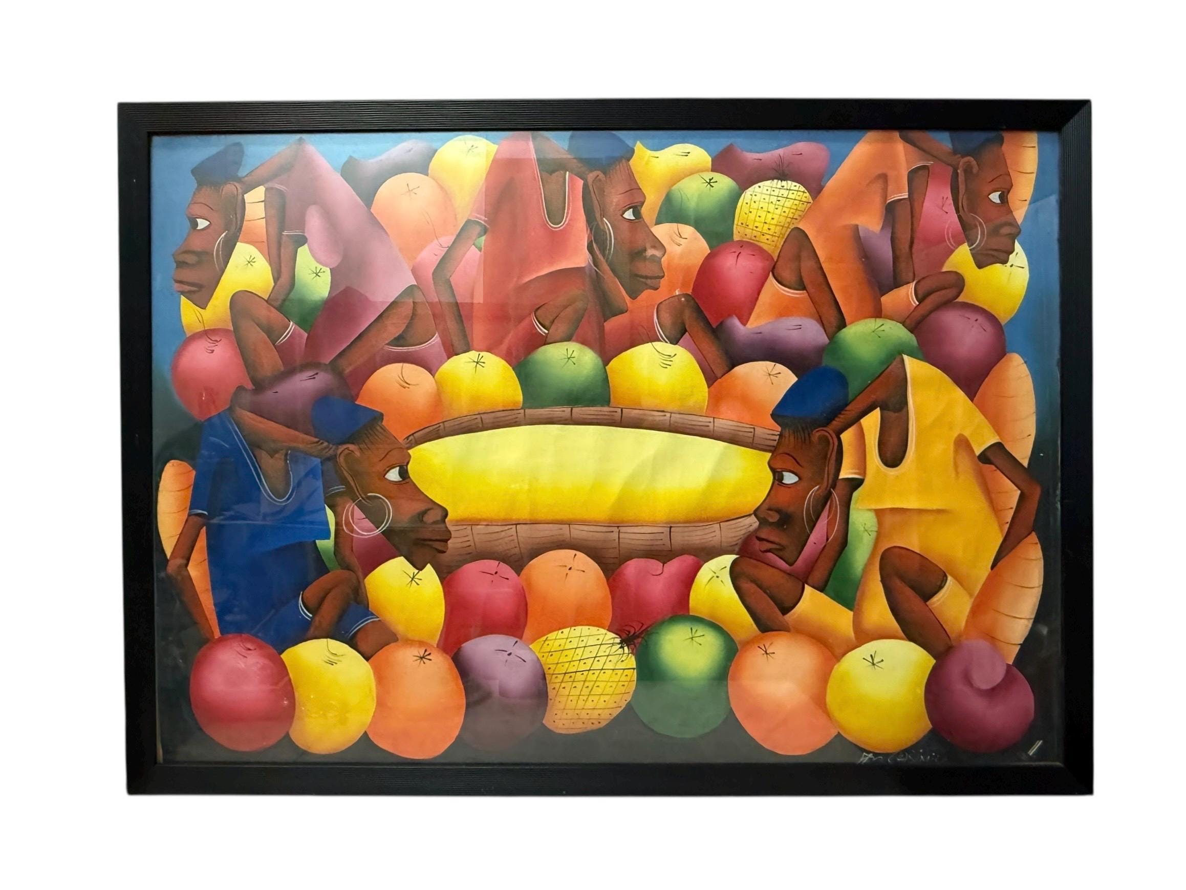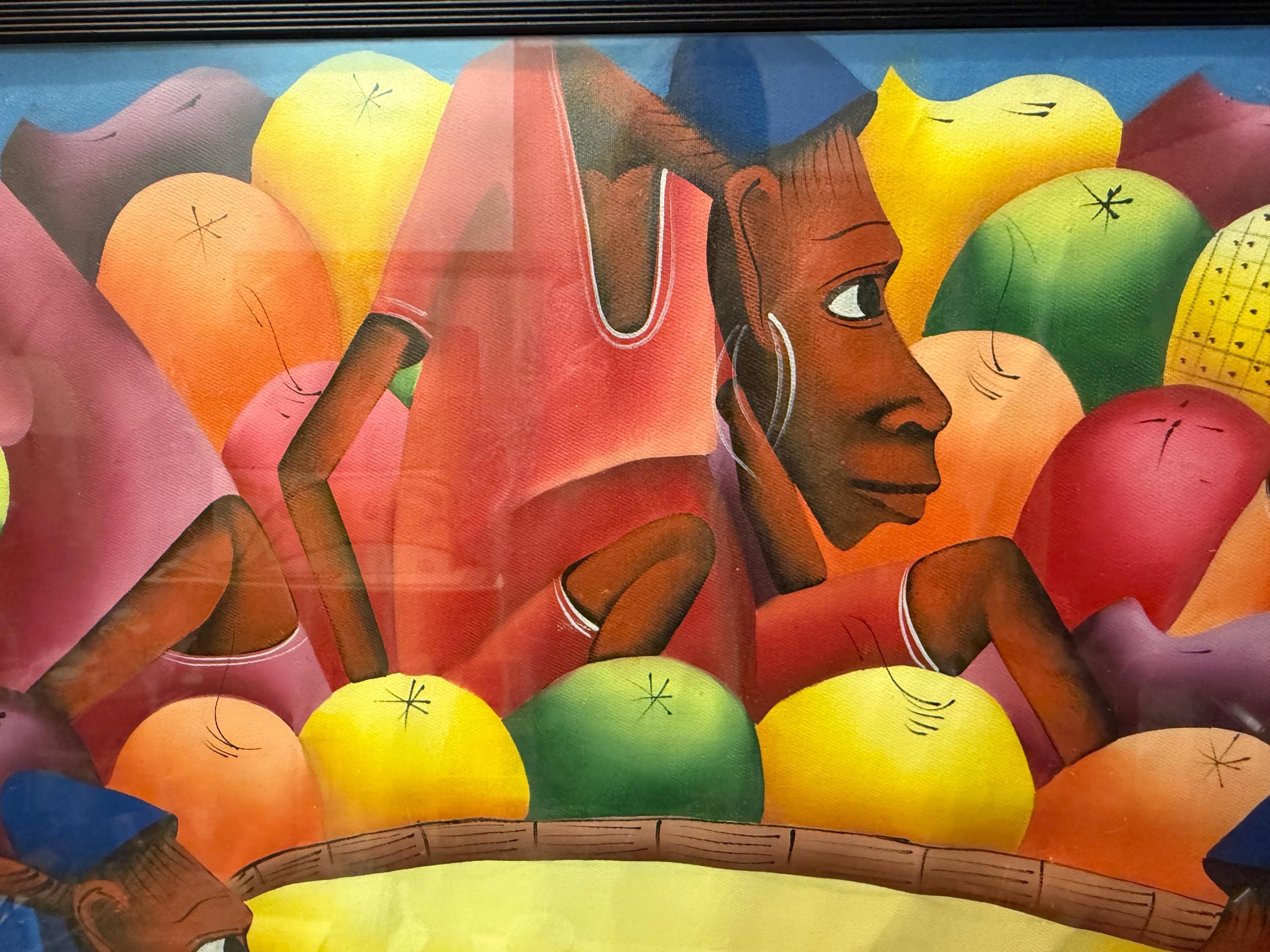A Haitian acrylic painting of a group of men.