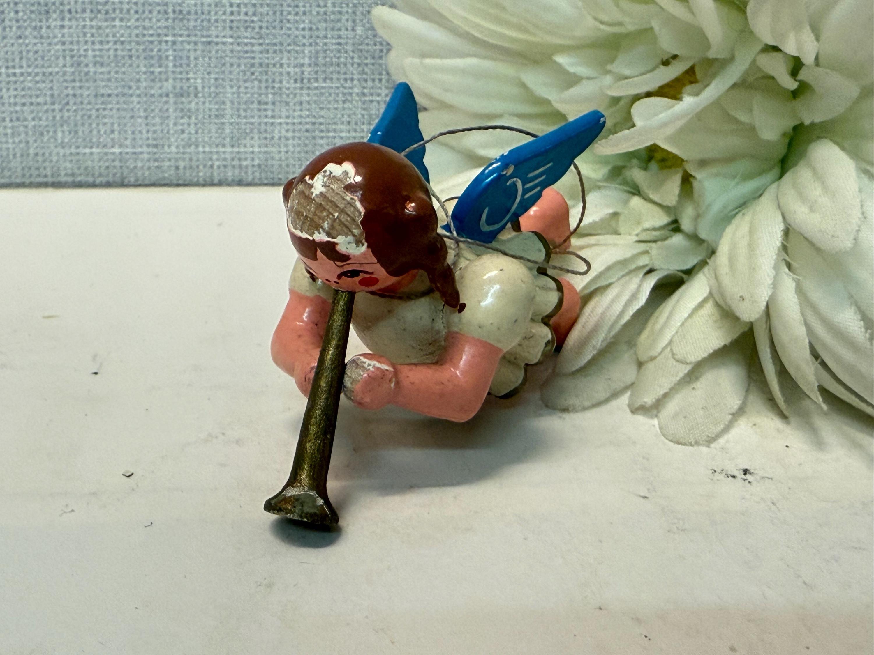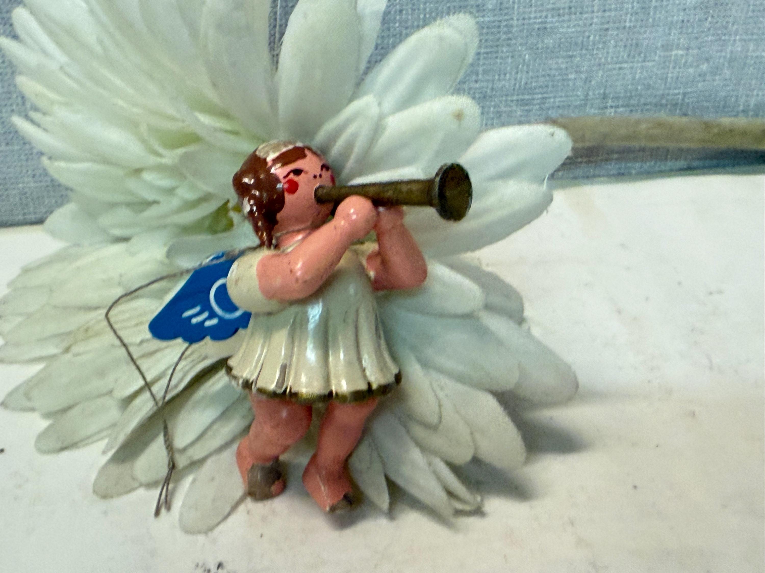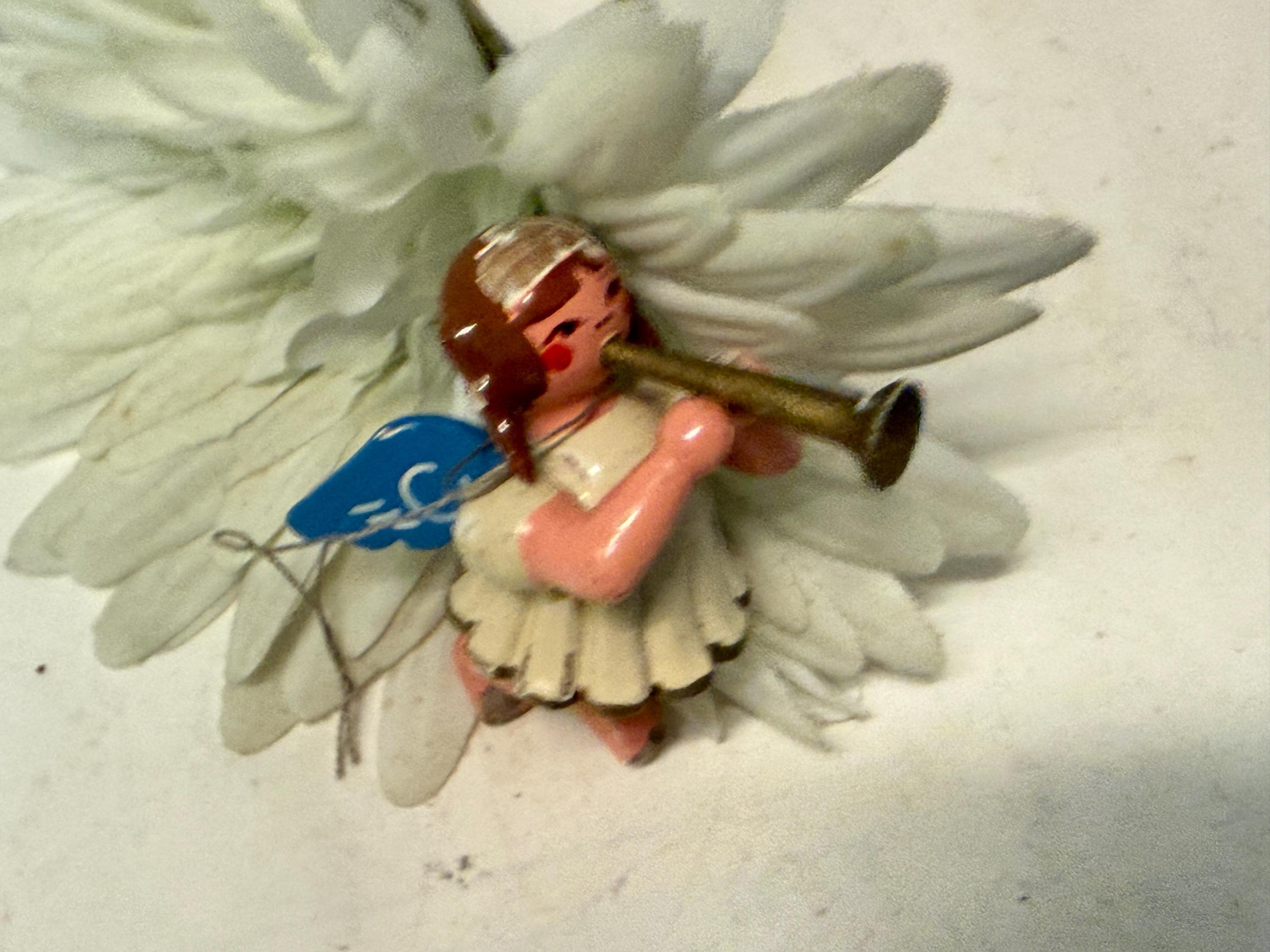 Beautiful old vintage angel with horn for hanging, from the Ore Mountains by Kühne and Wendt